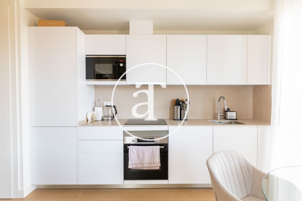 Ce lumineux appartement accueillant offre un espace confortable et bien agencé, idéal pour ceux qui recherchent praticité et tranquillité dans un quartier résidentiel bien desservi de Madrid. L'espace de vie comprend un séjour/salle à manger convivial et confortable avec un canapé, une télévision et une table pour quatre personnes, le tout baigné de lumière naturelle. De là, vous accédez à une terrasse extérieure avec vue dégagée sur la rue, parfaite pour savourer un café le matin ou se détendre en fin de journée. La cuisine américaine est entièrement équipée avec plaque vitrocéramique, four, réfrigérateur, lave-vaisselle, micro-ondes, cafetière et tous les ustensiles nécessaires au quotidien.
