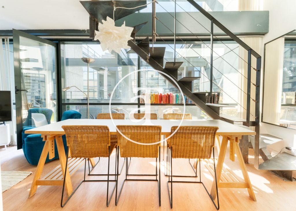 Ce duplex en location temporaire, situé dans un quartier mixte, alliant parfaitement bureaux, lofts et logements neufs, se distingue par sa luminosité grâce à sa grande baie vitrée qui longe la façade et inonde chaque recoin de lumière naturelle. Au rez-de-chaussée, le salon-salle à manger offre un espace chaleureux avec deux canapés, un fauteuil, une télévision et un accès direct à une grande terrasse de 6 m² meublée d'une table et de chaises, idéale pour prendre le petit-déjeuner ou se détendre en plein air. À l'intérieur, la salle à manger dispose d'une grande table pour quatre personnes et d'un coin bibliothèque. La cuisine intégrée est moderne et entièrement équipée : four, réfrigérateur, lave-vaisselle, micro-ondes, cafetière, grille-pain et ustensiles de cuisine. Cet étage dispose également d'une salle de bain complète avec douche.